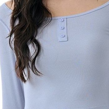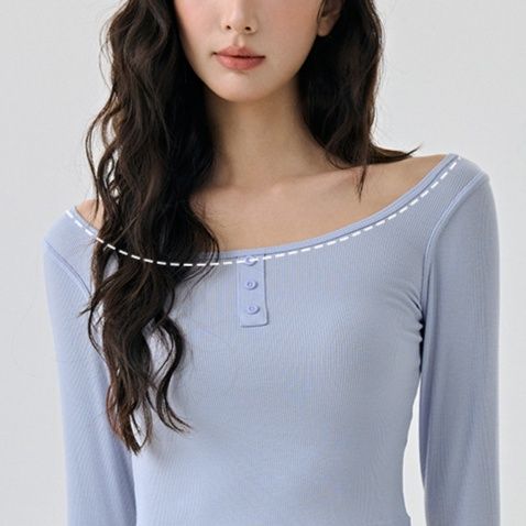 オフショルダーデザインと胸元のボタンがフェミニンな印象を演出し、ショート丈なので動きやすさも抜群です。