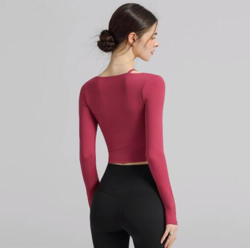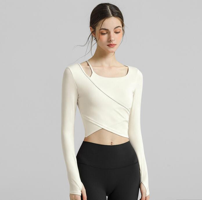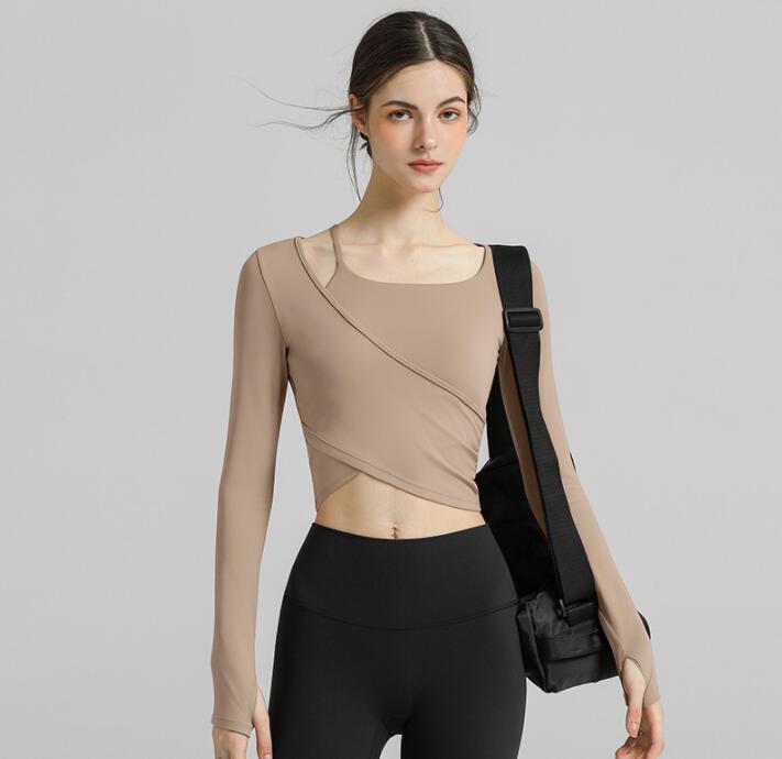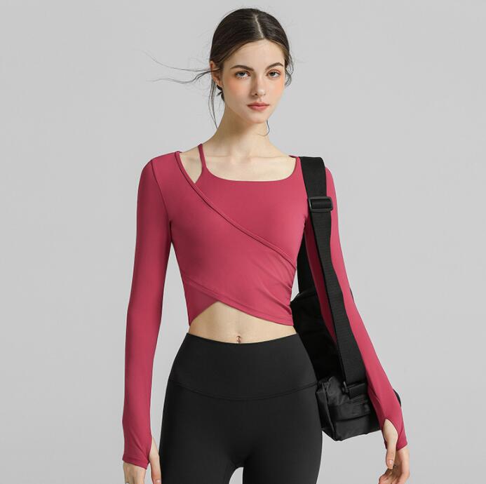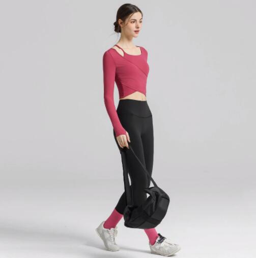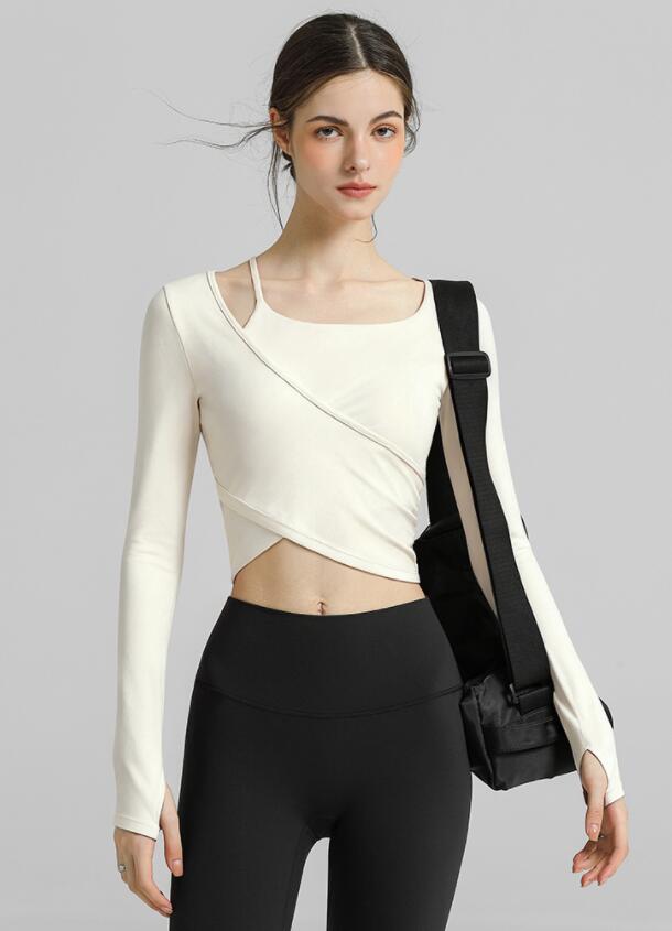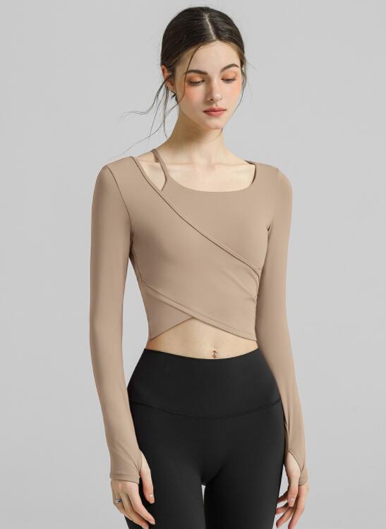 美しいクロスデザインが特徴的な長袖ヨガウェアトップス。