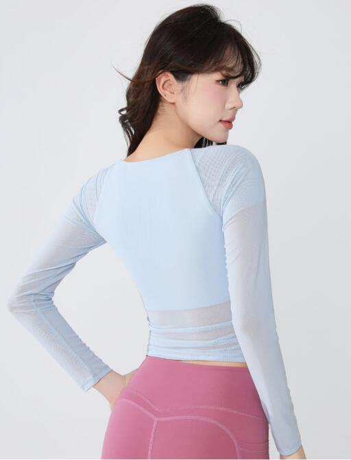 美しいライトブルーカラーが魅力的な長袖ヨガウェアトップスです。